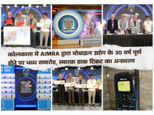 भारत में मोबाइल टेलीफोनी की शुरुआत के 30 साल पूरे होने के उपलक्ष्य में ऑल इंडिया मोबाइल रिटेलर्स एसोसिएशन (AIMRA) ने कोलकाता के ‘द आलमंड’ में एक भव्य समारोह का आयोजन किया। इस अवसर को चिह्नित करते हुए एक स्मारक डाक टिकट का भी अनावरण किया गया, जो देश में मोबाइल कनेक्टिविटी की परिवर्तनकारी यात्रा और डिजिटल भारत की दिशा में तीन दशकों की प्रगति का प्रतीक है।