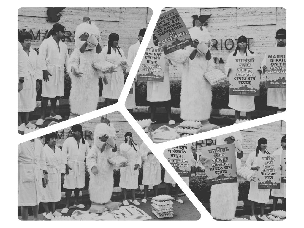 मर्सी फॉर एनिमल्स इंडिया संगठन की पहल पर आज ईएम बाईपास स्थित एक नामी होटल के सामने अनोखा विरोध प्रदर्शन किया गया। इस प्रदर्शन का संदेश था— “मैरियट, पशुओं के दुख पर आँख मत मूँदो, पिंजरामुक्त बनो।”